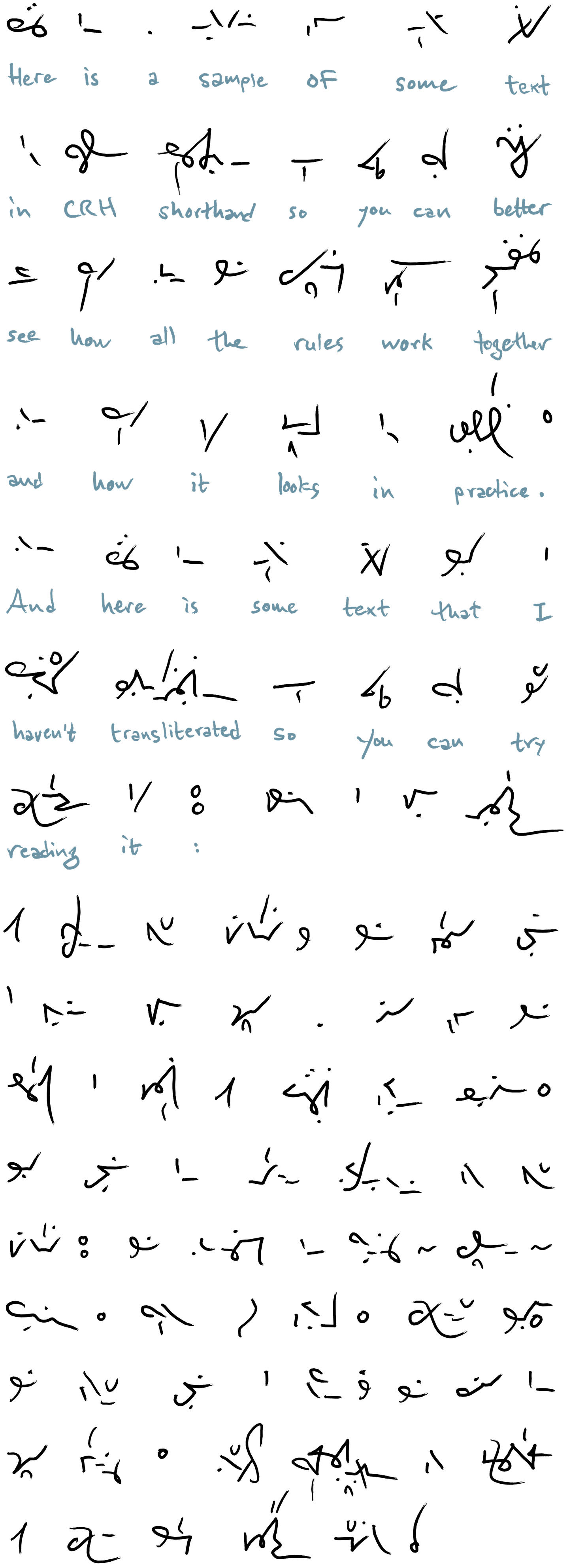 When designing this system, I didn’t pay much attention to its aesthetic value; I was mostly focused on the practical goals of speed and ease of learning. So I was delighted to discover the variety of lettering styles that are possible in CRH Shorthand — it opens up a world of forms that are not possible to access with the regular English alphabet.